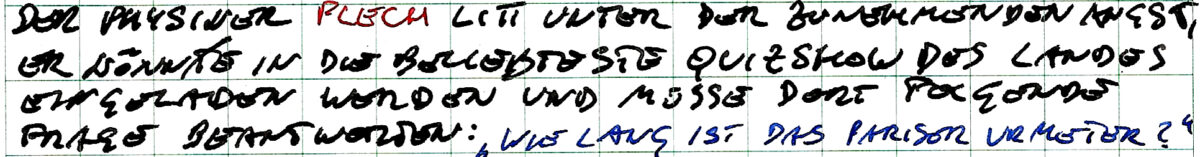 Der Physiker Plech litt unter der zunehmenden Angst, er könne in die beliebteste Quizshow des Landes eingeladen werden und müsse dort folgende Frage beantworten: »Wie lang ist das Pariser Urmeter?« Plech würde sich schon alleine dadurch lächerlich machen, dass er zuerst als Physiker vorgestellt würde, um dann eine scheinbar einfache Frage aus dem Gebiet der Physik nicht beantworten zu können. Noch schlimmer war es, dass Plech, der sich – trotz der Unwahrscheinlichkeit, tatsächlich in die Quizshow eingeladen zu werden, wofür er sich gar nicht beworben hatte – schon einmal darauf vorbereitete, die Frage nach der Länge des Pariser Urmeters trotz umfangreicher Recherchen und der Kontaktaufnahme mit bedeutenden Kollegen nicht beantworten konnte. Alles, was Plech herausfand, war, dass es offensichtlich drei verschiedene Pariser Urmeter gab und dass er nur eine Antwort mit Sicherheit ausschließen konnte, nämlich »1.000 Millimeter«.